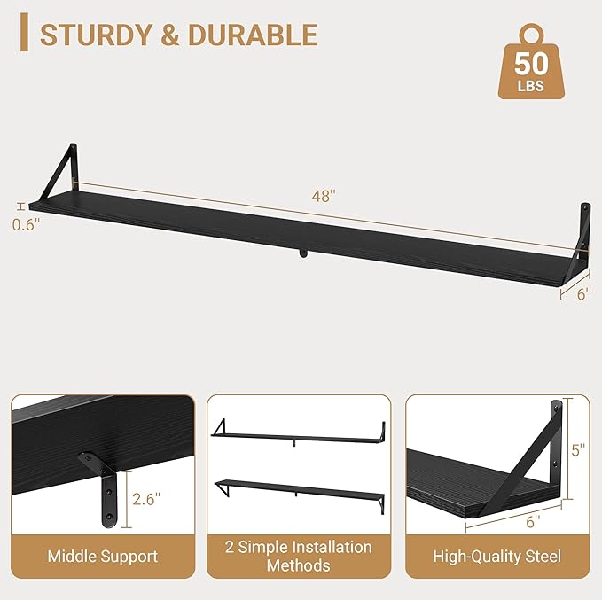 - 【STURDY & DURABLE】Each wood floating shelves is made of 0.6-inch thick natural wood planks and powder coated steel brackets for durability. The triangular metal brackets are even stronger and can hold up to 40 pounds