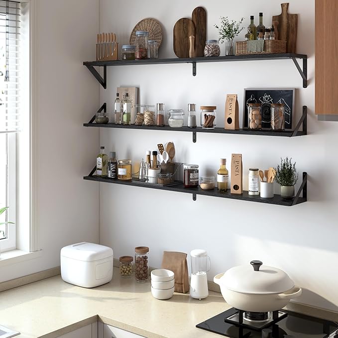 - 【MULTIFUNCTIONAL WALL SHELF】The floating shelves can turn a small area into an organized space, providing storage space for bedroom, bathroom, kitchen, easily placing greenery, books, crafts, spice jars, toiletries