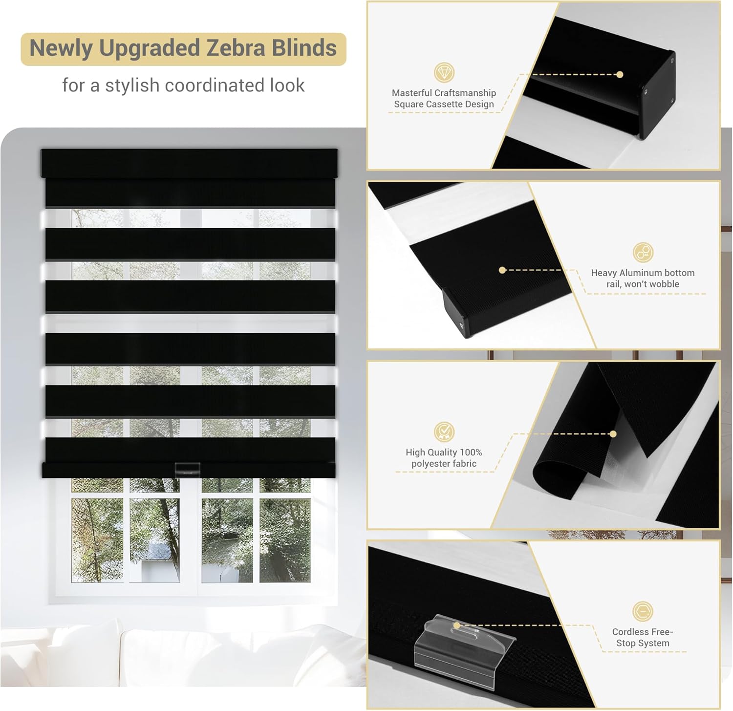 - 【Upgrade High-Quality Accessories】Our blind has been upgraded to have a sturdier bottom rail to prevent the fabric from fraying, which makes the two layers of fabrics more closely fit, maximizing the effect of shading. An anti-collision strip installed under the rail for protecting your window frame. Color-matched valance and the aluminum bottom bar suitable for all situations.