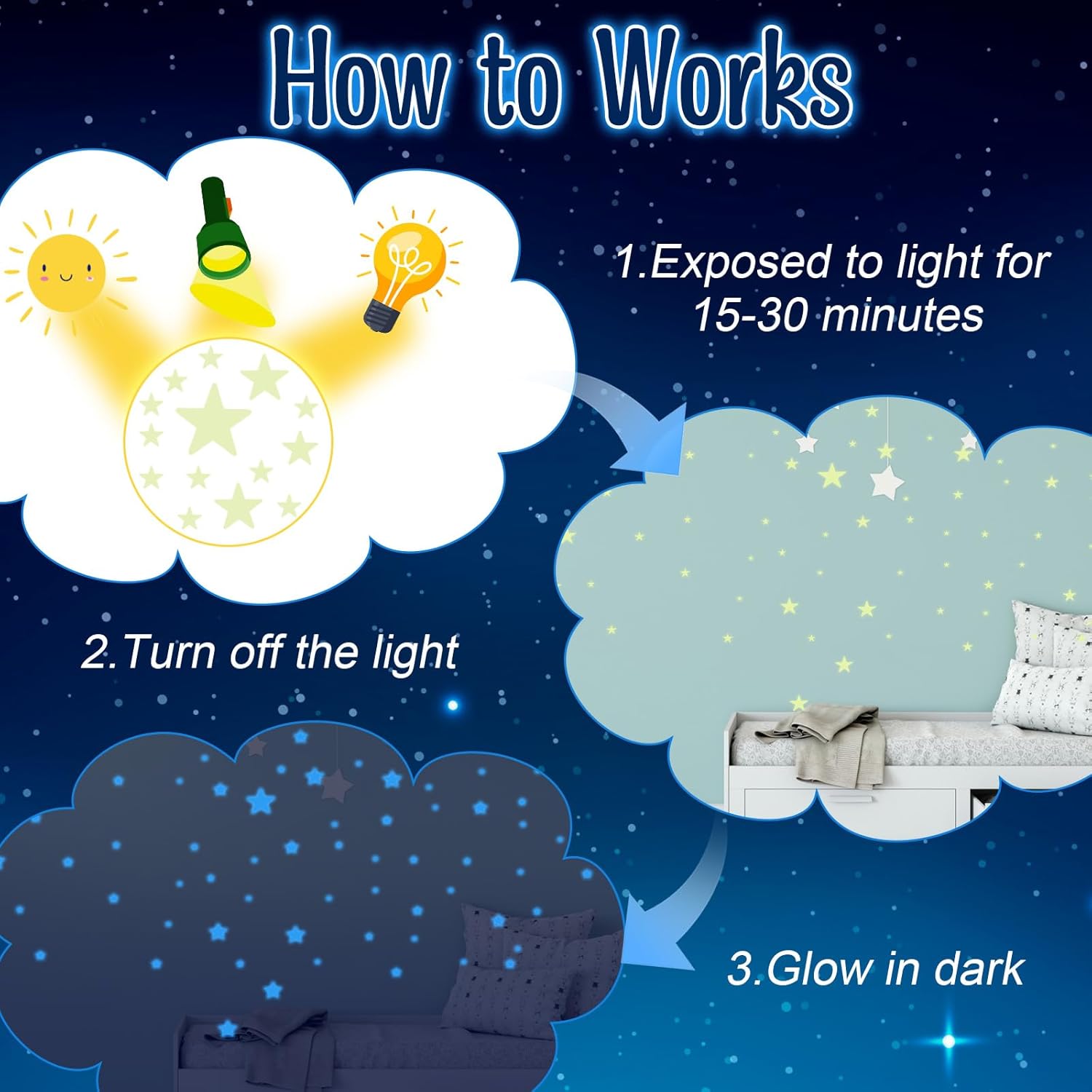 - Star Decoration Design: These glow in the dark stars for ceiling for girls are precise in details to create a real stargazing effect. The glow in the dark stars for ceiling or wall stickers only need to stay under the light source for a while, and they will shine at night, filling the room with natural brilliance.