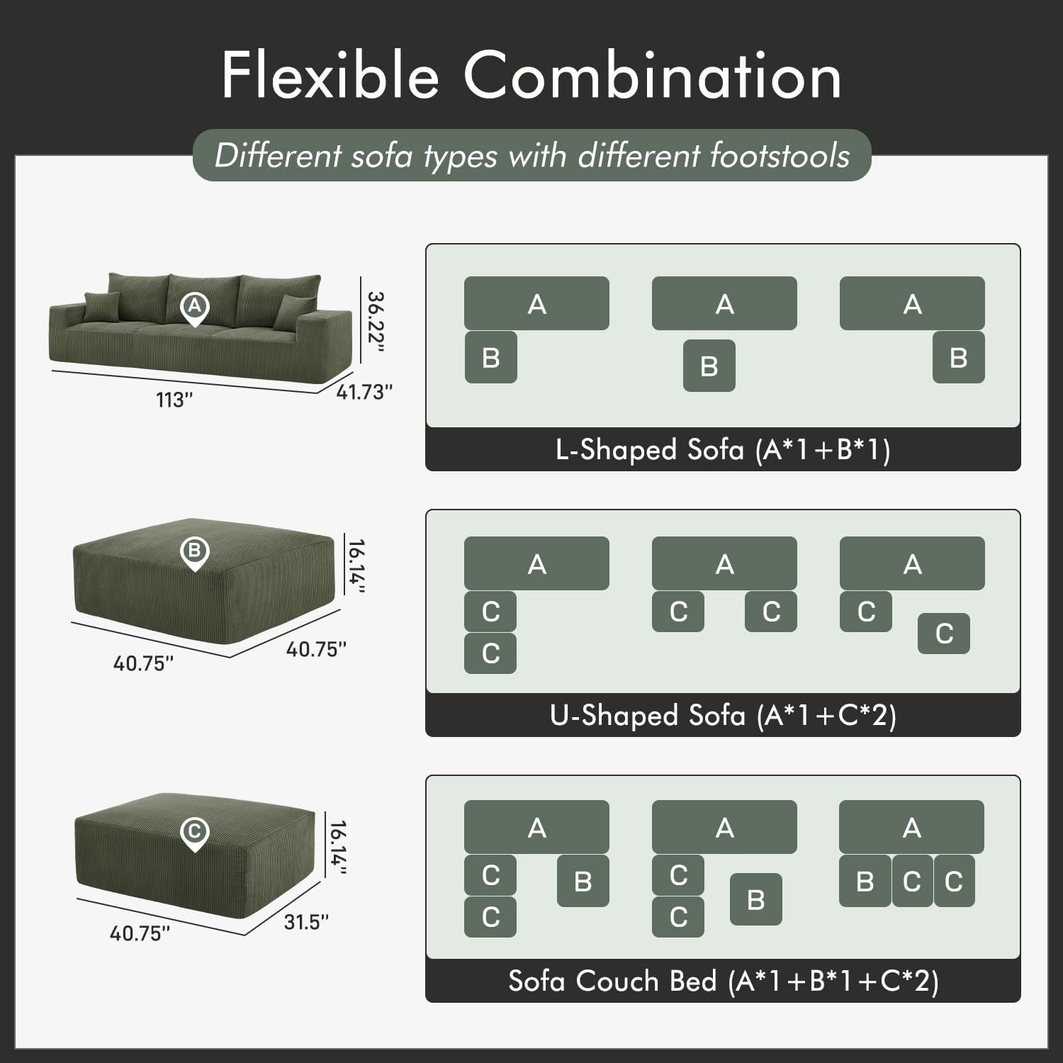 Boneless Sectional Cloud Couch Sofa Bed for Living Room, 112" Modular Modern Lounge 3 Seater Sleeper Green Couches with Chaise, No Assemble, Cordury Compression Upholstered Sofas