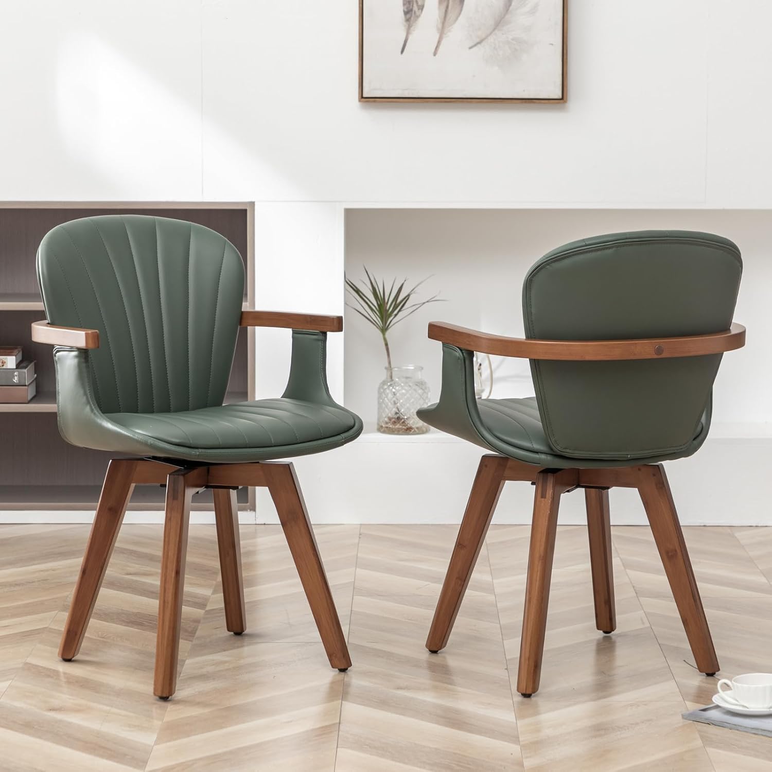 LUNLING Swivel Dining Chairs Set of 4, Mid Century Modern Green Faux Leather Kitchen Chairs with Arms,Bamboo Legs Side Chairs No Wheels,Accent Chair for Dining Rooms and Offices