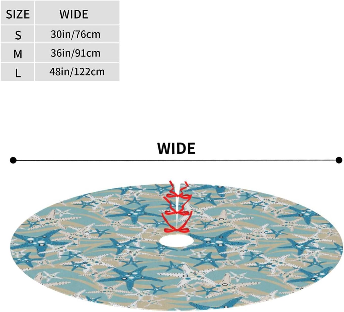- Beach Tree skirt is measuring 48" , this tree skirt is perfect for any sized Christmas tree.Put it on the bottom of the tree, it can be a nice gift for your family and friends.In addition, the Christmas tree skirt is perfect for hiding the tree frames and all the light ropes, covering up your tree stand to keep your floors clean from pine needles or tree sap and offering a place to prop presents