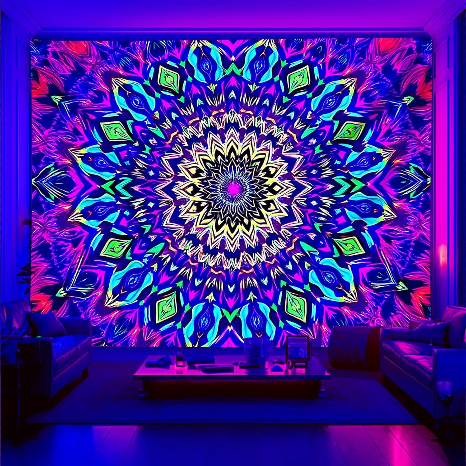 PSYHILAR Blacklight Mandala Tapestry for Bedroom, Medium Black Light Posters for Adults and Teens, Colorful UV Reactive Aesthetic Bohemian Wall Art Decor (60 x 50 Inches)